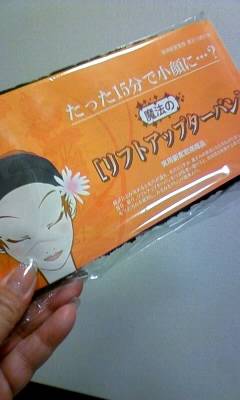 キタコレキタコレ!さっそく使ってみました! フィット感はだいぶギュイーな感じです。 あんまり長時間つづけて使用しないようにって書いてあります。 アレだな、アレ。 子供のころカチューシャつけてて頭が痛い痛いって騒いでて、 お母さんがカチューシャ外したとたん「治った!」って言って 「あんたは孫悟空か!!」 って言われた時のことを思い出しましたw そんなことは、どうでもいいです。はい。 徐々に上にずり上がる構造によって、リフトアップ効果らしい。 毛穴がたるむことによって汚れもたまるから、これでグイーと あげて洗顔して、グイーってなってるとこに化粧水がグイグイ 入るっていう仕組みらしい。へえーーー!! お顔のエクササイズもちょっと書いてあったので、やりました。 毛穴が気になる私としては、効果がありますように!!!!! と願うばかりですなぁ。 リフトアップターバン